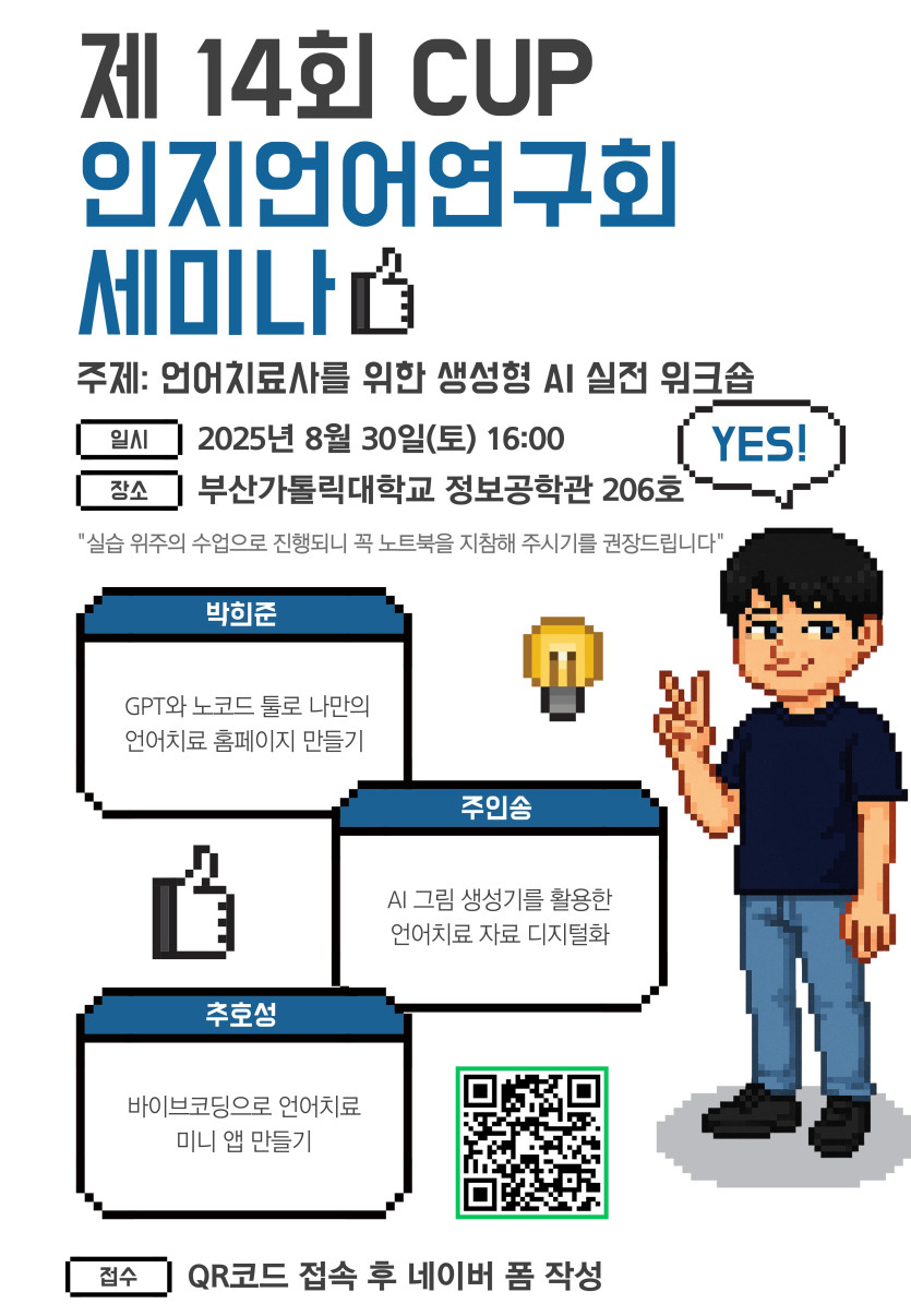 [25년 8월 30일(토)]제14회 인지언어연구회 세미나 작성자 정보 최고관리자 작성 작성일 2025.08.05 14:14 컨텐츠 정보 201 조회 목록 답글 쓰기 본문 제14회 인지언어연구회 세미나는 AI를 주제로 진행될 예정입니다. 많은 참여 바랍니다. 관련자료 이전 [25년 9월 27일(토)]제15회 인지언어연구회 세미나 작성일 2025.09.17 10:39 다음 [25년 7월 26일(토)] 제13회 인지언어연구회 세미나 작성일 2025.07.10 16:40 댓글 0 등록된 댓글이 없습니다. Select File Upload File 목록 답글 쓰기
