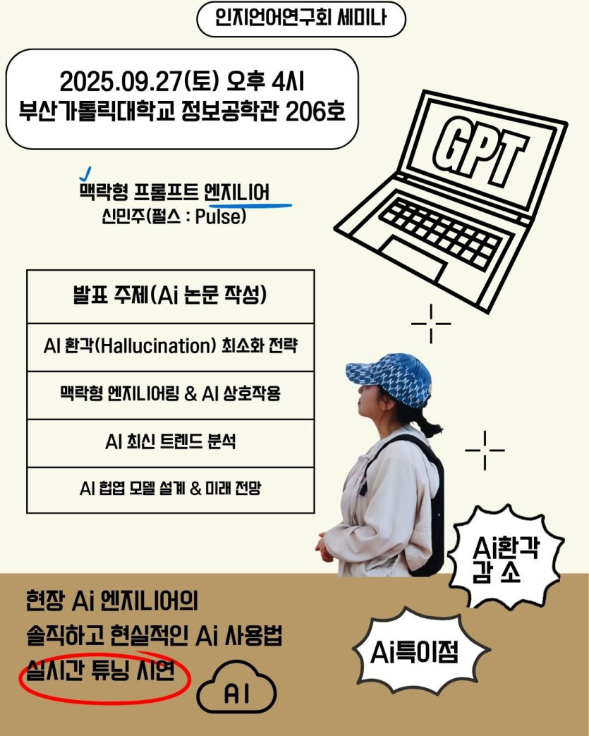 [25년 9월 27일(토)]제15회 인지언어연구회 세미나 작성자 정보 최고관리자 작성 작성일 2025.09.17 10:39 컨텐츠 정보 297 조회 10 댓글 목록 답글 쓰기 본문 제15회 인지언어연구회는 AI 전문가 초청이 이루어질 예정입니다. 많은 관심 부탁드립니다. 관련자료 이전 [25년10월 25일(토)] 제16회 인지언어연구회 세미 작성일 2025.10.22 15:33 다음 [25년 8월 30일(토)]제14회 인지언어연구회 세미나 작성일 2025.08.05 14:14 댓글 10 박희준님의 댓글 박희준 작성일 2025.09.17 12:57 박희준, 권순복 참석합니다. 답글 삭제 박희준, 권순복 참석합니다. 장태영님의 댓글 장태영 작성일 2025.09.17 19:33 장태영 참석합니다. 답글 삭제 장태영 참석합니다. 김상균님의 댓글 김상균 작성일 2025.09.18 10:39 김상균, 김중현 참석합니다. 답글 삭제 김상균, 김중현 참석합니다. 이동준님의 댓글 이동준 작성일 2025.09.19 13:29 이동준 참석합니다. 답글 이동준 참석합니다. 김유나님의 댓글 김유나 작성일 2025.09.20 18:12 김유나, 김승환 참석합니다. 답글 삭제 김유나, 김승환 참석합니다. kr4hsh11님의 댓글 kr4hsh11 작성일 2025.09.22 10:02 김주연, 황수현 참석합니다. 답글 김주연, 황수현 참석합니다. wonug님의 댓글 wonug 작성일 2025.09.22 18:55 이하민 참석합니다 답글 삭제 이하민 참석합니다 15기박수은님의 댓글 15기박수은 작성일 2025.09.25 16:41 박수은 참석합니다 답글 박수은 참석합니다 임동원님의 댓글 임동원 작성일 2025.09.27 16:12 임동원 참석합니다 답글 삭제 임동원 참석합니다 wns1님의 댓글 wns1 작성일 2025.09.30 16:15 저분 지피티 쪽 언더에서는 월클... 와 다시 세미나에 오시는 (?) 기회가 있을까요? 답글 저분 지피티 쪽 언더에서는 월클... 와 다시 세미나에 오시는 (?) 기회가 있을까요? Select File Upload File 목록 답글 쓰기